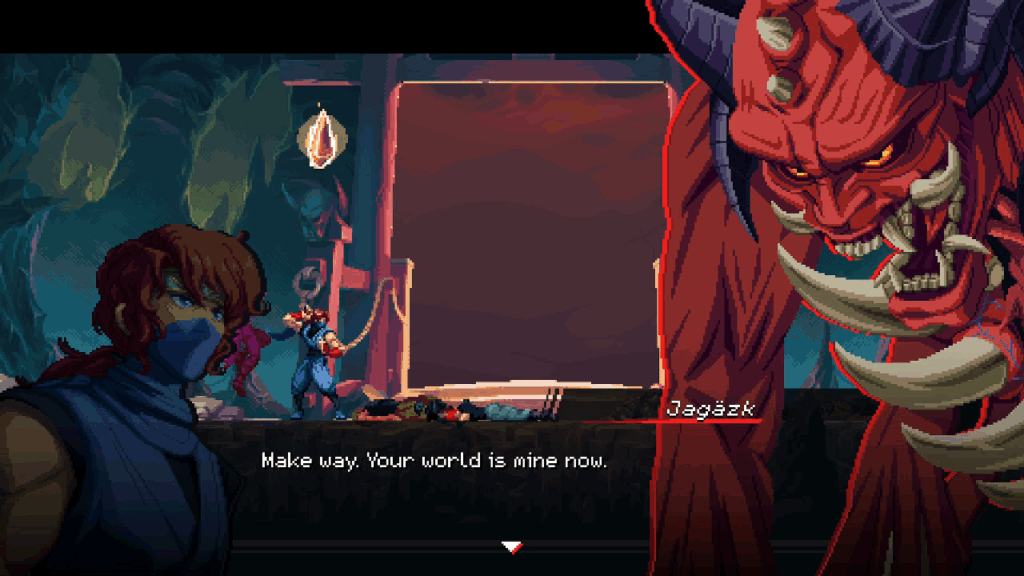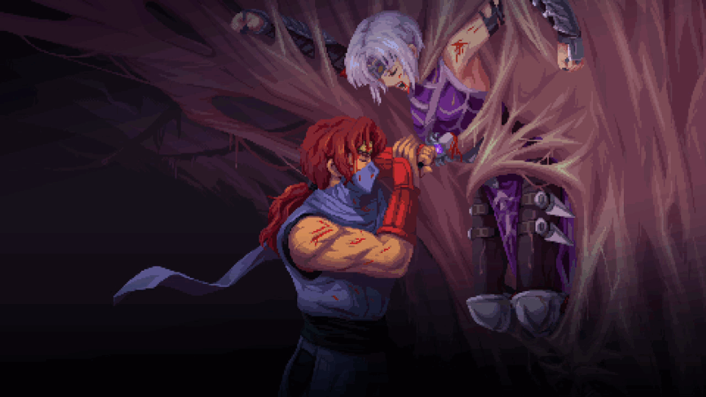 Ragebound’s story is too ridiculous to be accepted as anything but deliberately silly and bombastic, as exemplified by a character summarizing their situation with the line, “the CIA is toying with demon energy to create super soldiers.” The real attraction is the tight hack-and-slash combat based on prototypical ninja skillsets and platforming design inspired by the classic Ninja Gaiden titles from the 8-bit videogame generation. Fans of the first Ninja Gaiden videogames may also be enticed by a cameo from Ryu Hayabusa, the series’ original protagonist, and hints that his adventures in the United States are happening concurrently with Kenji and Kumori’s quest.