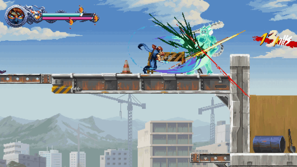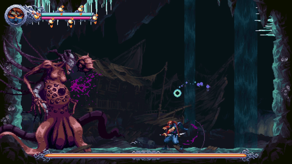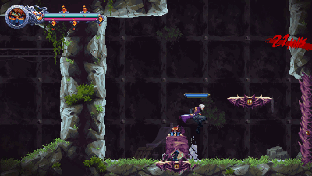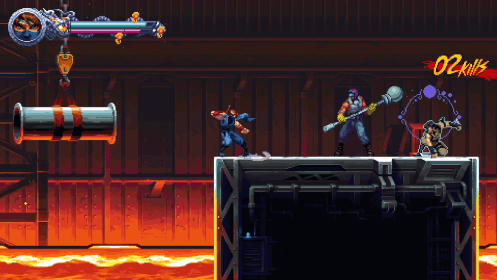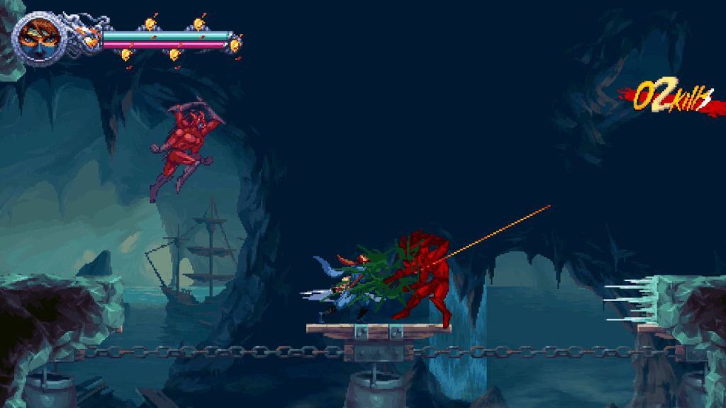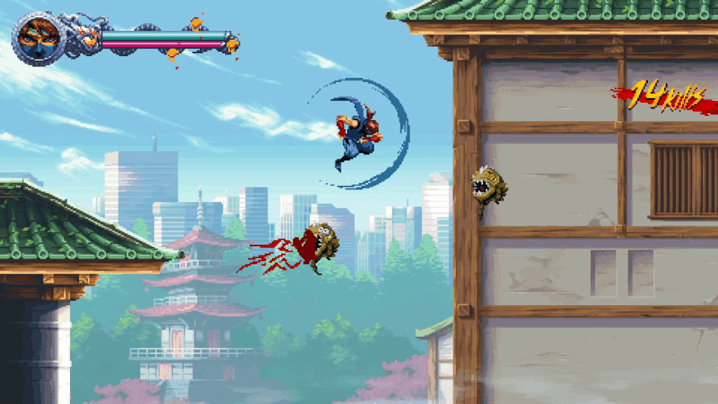 As demanding as all of this ninja action and platforming is to my abilities, it is also forgiving. Kenji and Kumori share a lengthy hit point meter that is topped up often by regular checkpoints and passive healing effects, so even if they miss a jump, stumble into an enemy, or renew their hypercharged attack, there’s a lot of wiggle room to make those mistakes. Ragebound is challenging, but not grueling or even unfair in its platforming demands.