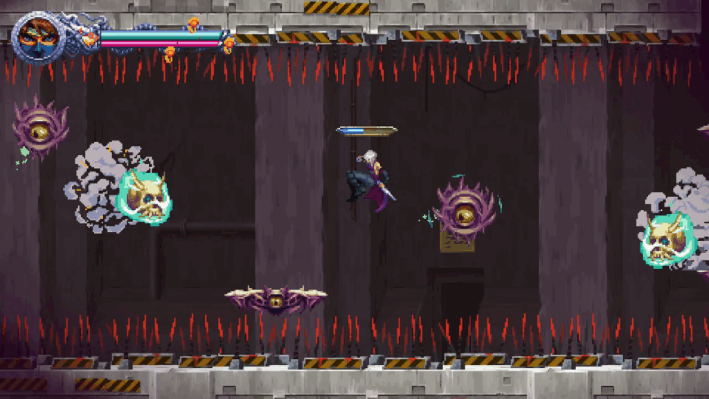 Most levels exploit all of the player characters’ abilities to add new dimensions to the platforming. A typical scenario requires them to leap from a wall, slide down a rope, bounce off a demon with a Guillotine Boost, then cling to the ceiling to bypass a long series of spike traps and bottomless pits laid out beneath them. These short, lightning-quick platforming sequences nearly always deposit the player characters directly into another battle.